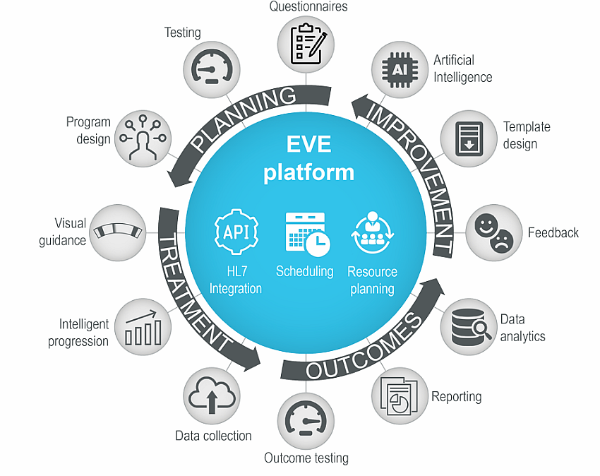 The EVE platform manages the whole treatment process, guides through individual exercises and collects all the data for reporting. It helps therapists in making better treatment choices and motivates clients in their recovery journey..